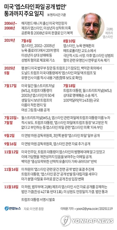 (워싱턴=연합뉴스) 조준형 이유미 특파원 = 미국 정가에 다시 한번 풍파를 몰고 온 성범죄자 고(故) 제프리 엡스타인 사건 자료(엡스타인 파일) 공개를 강제하는 법안이 18일(현지시간) 양원 만장일치 수준으로 연방의회 문턱을 넘었다.