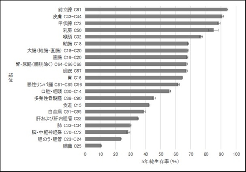 19일 일본 국립암연구센터가 홈페이지에 공개한 2012~2015년 암 진단 환자의 5년 생존율 분석 자료에 따르면 15세 이상 암 환자의 5년 생존율은 위암 63.5%, 대장암 67.2%, 폐암 35.5% 등이었다. 이번 분석에는 44개 도도부현의 254만7천명의 자료가 사용됐다.