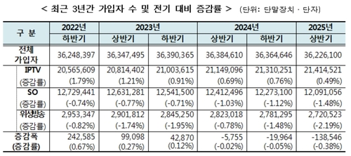 유료방송 가입자는 2023년 하반기에 3천639만465명으로 최대치를 기록한 이후 3개 반기 연속으로 감소하고 있다.