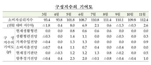 11월에는 CCSI를 구성하는 6개 지수 중 향후경기전망(102·8p) 상승 폭이 가장 컸고, 현재경기판단(96·5p), 가계수입전망(104·2p), 생활형편전망(101·1p) 등도 나란히 올랐다.