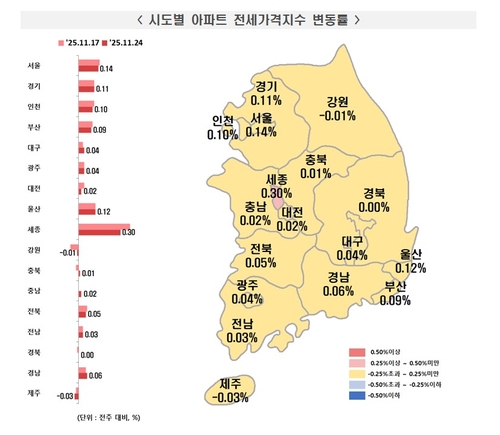 전국 아파트 전세가격 상승률은 직전 주와 동일한 0.08%를 기록했다.