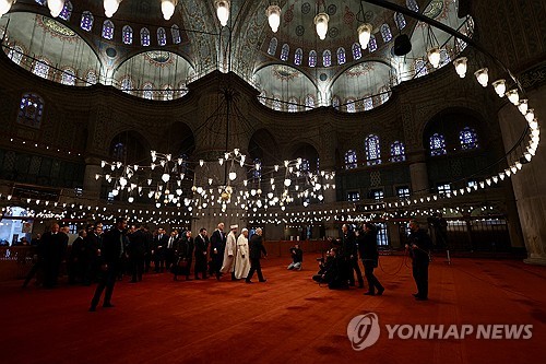 (모스크바=연합뉴스) 최인영 특파원 = 레오 14세 교황이 29일(현지시간) 튀르키예 이스탄불에 있는 이슬람 사원 블루 모스크를 방문했다.