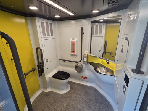 화장실도 열차 한 편성(세트)에 장애인용, 비장애인용이 모두 설치돼 있었다. 장애인용 화장실은 휠체어가 출입할 수 있도록 문 폭이 넓고 만일 쓰러지더라도 도움을 요청할 수 있도록 벽과 바닥 근처에 비상벨이 하나씩 있었다. 세면대 옆에는 인슐린 주사기 등을 안전하게 처리할 수 있는 의료폐기물 수거함도 보였다.