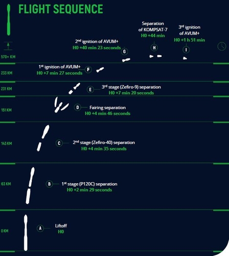 아리안스페이스가 이날 공개한 VV28 언론설명자료에 따르면 아리랑 7호는 발사 44분 후 고도 576㎞ 태양동기궤도(SSO)에 배치된다. 위성 무게는 1천810㎏가량이다.