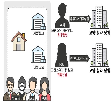 남매인 A씨와 B씨는 실제로는 부모와 함께 부모 소유 단독주택에 거주하면서도 무주택 세대 구성원 청약 자격을 얻고자 허위로 인근 창고 건물 2동에 각각 위장전입한 뒤 고양시에서 분양하는 주택에 추첨제로 청약해 각각 당첨됐다가 위장전입으로 적발됐다.