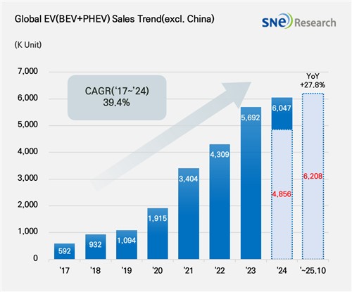 SNE리서치는 "올해 들어 중국을 제외한 글로벌 전기차 시장은 주요 지역별 정책 변화와 수요 구조의 차이에 따라 온도 차가 더욱 뚜렷해지고 있다"며 "글로벌 완성차 기업들은 기술 내재화, 현지 조달, 저가형·하이브리드·리튬인산철(LFP) 모델 확대 등 비용 효율 전략으로 각 지역의 다른 규제와 전환 속도에 대응하고 있다"고 분석했다.