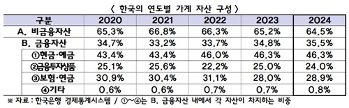 보고서에 따르면 지난해 한국의 비금융자산(부동산 등) 비중은 64.5%로 한국·미국·일본·영국 4개국 가운데 가장 높았다. 미국은 32%, 일본(2023년 기준)은 36.4%, 영국은 51.6%였다.