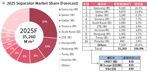 올해 글로벌 분리막 시장 또한 상위 기업의 대부분을 중국 업체가 차지하며 중국 중심의 과점 구조가 고착화했다.
