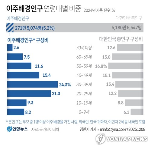작년 이주배경인구는 271만5천명으로, 총인구(5천180만6천명)의 5.2%를 차지했다.
