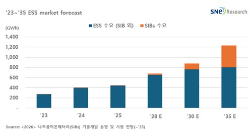 특히 나트륨 이온 배터리(SIBs)는 에너지저장장치(ESS) 시장 확대에 힘입어 2030년 13.4%, 2035년 최대 35%의 ESS 시장 점유율을 가져갈 것으로 분석됐다.