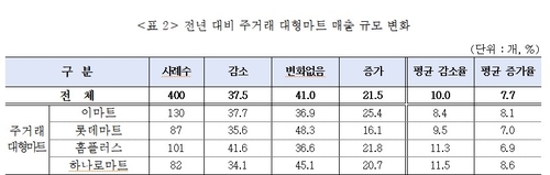 반면 매출액이 늘어났다고 밝힌 중소기업의 평균 증가율은 6.9%로, 대형마트 가운데 가장 낮았다.
