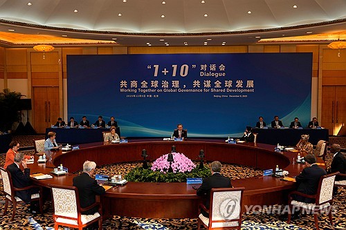 이날 회의는 '글로벌 거버넌스를 함께 상의하고 글로벌 발전을 함께 도모'하는 것을 주제로 중국과 10개 경제기구 지도자가 참석하는 '1+10' 대화로 진행됐다.