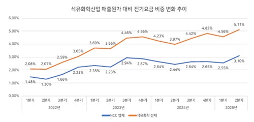 한국화학산업협회에 따르면 산업용 전기요금은 꾸준히 상승해 올해 2분기 기준 석화 산업 매출원가의 5.11%를 차지했다.