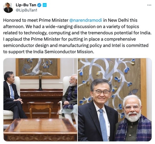 탄 CEO는 X에 "포괄적인 반도체 설계·제조 정책을 수립한 총리의 결단을 높이 평가한다"며 "인텔은 '인도 반도체 미션'을 지원하기 위해 최선을 다하겠다"고 밝혔다.