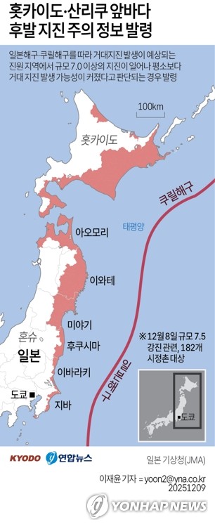 (도쿄=연합뉴스) 박상현 특파원 = 일본 정부가 혼슈 동북부 아오모리현 앞바다에서 지난 8일 밤 발생한 규모 7.5의 강진을 계기로 '홋카이도·산리쿠 앞바다 후발 지진 주의 정보'를 처음 발령하면서 열도 내에서 긴장과 경계감이 확산하고 있다.