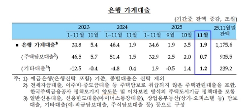 대출 종류별로는 전 금융권 주택담보대출이 2조6천억원 불었다. 다만 증가액은 10월(+3조2천억원)보다 감소했다. 신용대출 등 기타 대출 증가 폭(+1조6천억원)은 전월(+1조7천억원)과 비슷했다.