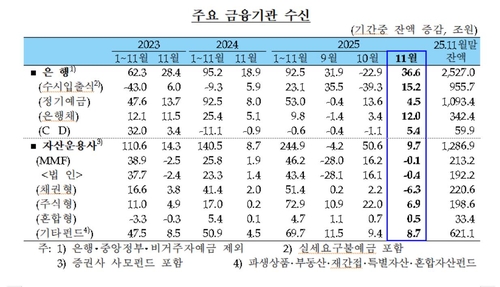 자산운용사의 수신은 주식형펀드(+6조9천억원)와 기타펀드(+8조7천억원)에서 증가했지만, 머니마켓펀드(MMF·-1천억원)와 채권형펀드(-6조3천억원)에서 빠져나갔다.
