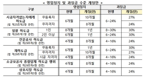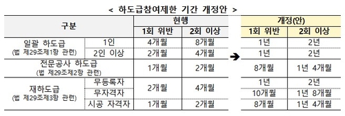 아울러 개정안은 불법하도급으로 행정처분을 받을 시 공공 건설 공사 하도급 참여 제한 기간을 현행 1∼8개월에서 8개월∼2년으로 상향했다.