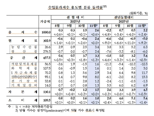 한국은행이 12일 발표한 수출입물가지수 통계에 따르면 11월 기준 수입물가지수(원화 기준 잠정치·2020년 수준 100)는 141.82로, 10월(138.19)보다 2.6% 올랐다.