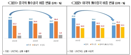 유엔무역개발회의(UNCTAD) 데이터에 따르면 중국의 대미 수출 비중은 2015년 18.0%에서 2024년 14.7%로 3.3%포인트 하락한 반면, 동남아와 인도 비중은 같은 기간 각각 12.2%에서 16.4%, 2.6%에서 3.4%로 증가했다. 미국의 대중 수입 비중도 21.8%에서 13.8%로 줄었고, 멕시코는 최대 수입국으로 올라섰다.
