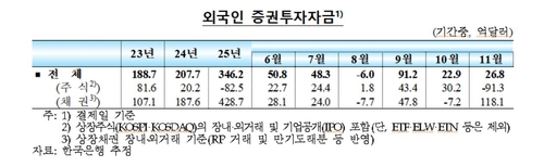 한국은행이 12일 발표한 '국제금융·외환시장 동향'에 따르면 11월 중 외국인 증권(주식·채권) 투자자금은 26억8천만달러 순유입됐다. 원화로는 지난달 말 원/달러 환율(1,470.6원)을 기준으로 약 3조9천400억원 규모다.
