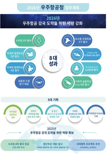 윤 청장은 "2026년 우주청 예산 최초 1조 원 시대를 열고 미래를 준비하는 성과 확보에 박차를 가할 것"이라며 "누리호 5차 발사로 우리 발사체의 신뢰성을 높이고, 재사용발사체 개발 착수로 글로벌 경쟁력을 갖춘 기술을 확보하고, 미래항공기(AAV) 개발을 선도하는 등 전략적 투자 확대로 항공우주 5대 강국을 향한 도약에 나설 것"이라고 밝혔다.