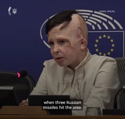 (파리=연합뉴스) 송진원 특파원 = 러시아의 공습에 어머니를 잃고 자신 역시 크게 다친 한 우크라이나 어린이가 유럽의회에서 "우크라이나 아이들을 계속 도와야 한다"고 호소했다.