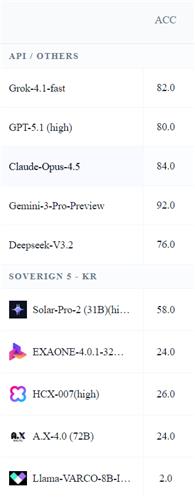 해외 모델에는 GPT-5.1, 제미니 3 프로 프리뷰, 클라우드 오푸스 4.5, 그록 4.1 패스트, 딥시크 V3.2 등이 활용됐다.