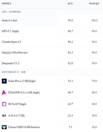 세 차례 문제 풀이를 시도해 정답을 맞히면 통과하는 방식을 활용했을 때 그록은 만점, 나머지 해외 모델은 90점을 기록했지만, 한국 모델은 솔라 프로-2가 70점, 엑사원이 60점을 기록했다.