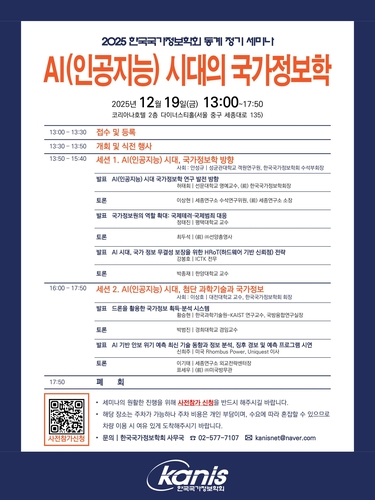 ▲ 한국국가정보학회는 오는 19일 서울 중구 코리아나호텔에서 'AI 시대의 국가정보학' 동계 정기 세미나를 연다. 세미나는 'AI 시대 국제 테러 및 국제 범죄에서 국가정보원의 역할', 'AI 시대 국가정보 무결성 보장을 위한 HRoT(하드웨어 기반 신뢰점) 전략', '드론을 활용한 국가정보 획득 및 분석 시스템', 'AI 기반 안보 위기 예측 최신 기술 동향과 정보 분석' 등을 주제로 한 발표가 포함됐다. 2세션에서는 AI 기반 안보 정보에 대한 분석, 경보, 예측 프로그램이 어떻게 작동되는지 직접 시연된다.