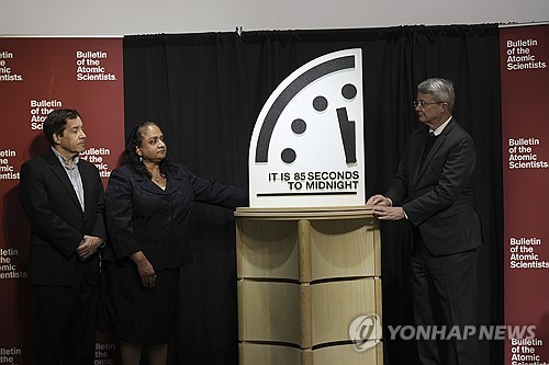 미국 핵과학자회(BSA)는 28일(현지시간) '지구 종말 시계'의 시간을 자정 85초 전으로 앞당겼다고 밝혔다.