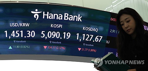 이날 오전 9시 3분 현재 코스피는 전장보다 133.42포인트(2.55%) 하락한 5,090.94에 거래되고 있다.
