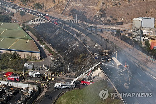 (멕시코시티=연합뉴스) 이재림 특파원 = 19일(현지시간) 칠레 수도권에서 가스를 싣고 가던 화물차가 도로에서 넘어진 후 폭발하면서, 최소 4명이 숨지고 10여명이 다쳤다.