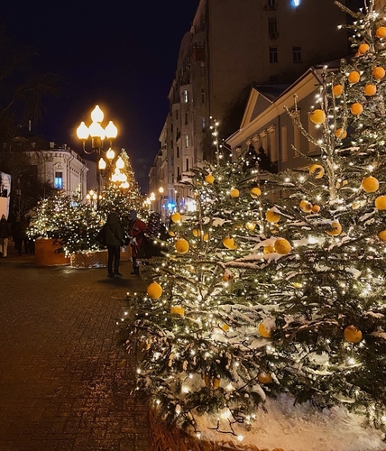 크리스마스 시즌이 끝나고 봄을 맞이하는 러시아 전통 축제 '마슬레니차' 주간이 진행되는 시기지만 아직 추운 날씨 때문인지 모스크바는 여전히 겨울 장식들로 반짝이고 있다. 저녁이 되자 조명이 켜지면서 아르바트 거리는 더욱 휘황찬란해졌다. 귤의 주황색이 부각되면서 추위 속에서도 따뜻한 분위기가 감돌았다.