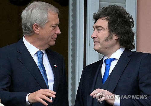 (멕시코시티=연합뉴스) 송광호 특파원 = 호세 안토니오 카스트 칠레 대통령이 취임 후 처음으로 1박2일 일정으로 아르헨티나를 방문해 6일(현지시간) 하비에르 밀레이 대통령과 정상회담을 가졌다고 부에노스아이레스 헤럴드 등 현지 매체가 보도했다.