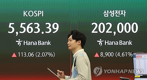 (서울=연합뉴스) 김유향 기자 = 코스피는 7일 중동 전쟁이 분수령을 맞이한 가운데 삼성전자[005930]의 '깜짝 호실적'에 힘입어 장 초반 2% 넘게 올라 5,570대를 기록했다.