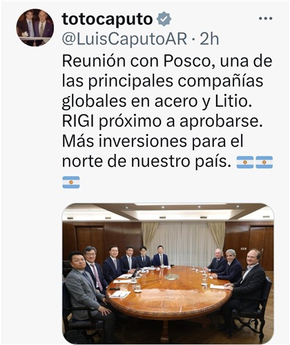 카푸토 장관은 이날 개인 사회관계망서비스(SNS) 엑스(X, 전 트위터)에 "철강과 리튬 분야의 세계 주요 글로벌 기업 중 하나인 포스코와 회의를 진행했다"며 "대규모 투자 인센티브 제도인 RIGI가 곧 승인될 예정"이라고 밝혔다. 이어 "아르헨티나 북부 지역에 대한 추가 투자 확대가 기대된다"고 덧붙였다.