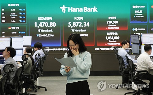 유가증권시장에서 코스피는 전날보다 377.56포인트(6.87%) 오른 5,872.34로 장을 마쳤다. 외국인 투자자가 2조4천722억원 순매수했다.