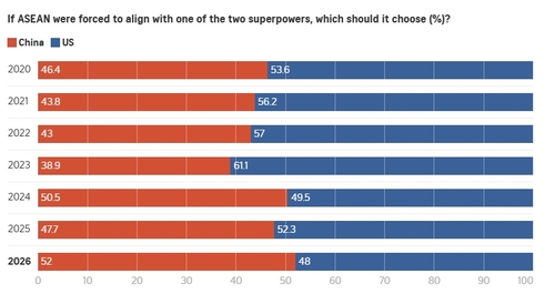8일 싱가포르 ISEAS-유소프 이샥 연구소가 아세안 회원국 정책 결정자와 전문가 등을 대상으로 실시한 설문 조사에 따르면 응답자의 52%는 미·중 양국 가운데 하나를 선택해야 할 경우 중국을 택하겠다고 답했다.