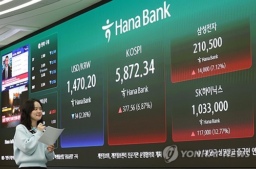 이날 코스피는 전장 대비 377.56포인트(6.87%) 오른 5,872.34로 장을 마쳤다.