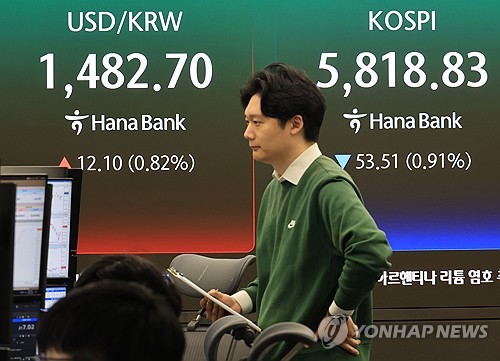 이날 오전 9시 1분 현재 코스피는 전날보다 52.92포인트(0.90%) 내린 5,819.42다.