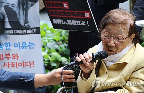 (도쿄=연합뉴스) 박상현 특파원 = "한국에서 지팡이 짚고 허리 아픈데도 여기까지 왔습니다. 사장님 잘 생각해 보세요. 사죄하라고 왔습니다. 100세가 돼도 사과받고 죽을 겁니다."