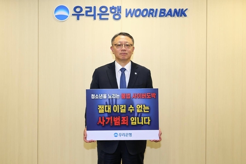 ▲ 정진완 우리은행장이 서울경찰청 주관 '청소년 불법도박 근절 릴레이 캠페인'에 참여했다고 우리은행이 12일 밝혔다. 정 행장은 "미래 세대가 도박의 유혹에 빠지지 않도록 안전한 금융 울타리를 만드는 데 최선을 다하겠다"고 말했다. 정 행장은 이호성 하나은행장 추천으로 캠페인에 동참했다, 다음 참여자로 진성원 우리카드 사장을 추천했다. (서울=연합뉴스)