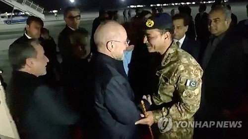 이란 민간항공사 메라즈항공 여객기 편으로 도착한 이란 대표단이 비행기에서 계단으로 내려오자 무니르 총사령관 등 파키스탄 측 인사들은 서로 뺨을 맞대는 중동식 인사로 이들을 반갑게 맞았다.