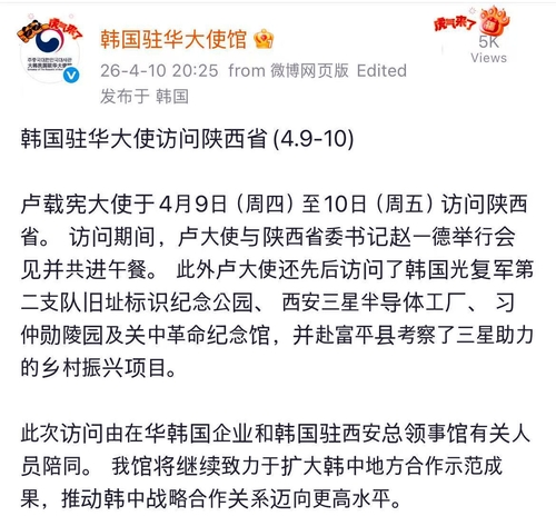 13일 주중 한국대사관 소셜미디어 웨이보에 따르면 노 대사는 지난 9∼10일 산시성을 방문했다.