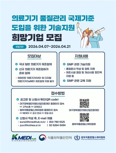 (서울=연합뉴스) 유한주 기자 = 식품의약품안전처는 '2026년 의료기기 품질관리 국제기준 도입을 위한 기술지원' 사업 참여 희망업체를 모집한다고 13일 밝혔다.