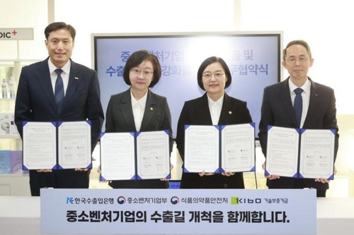(서울=연합뉴스) 한지훈 기자 = 한국수출입은행은 13일 중소벤처기업부, 식품의약품안전처, 기술보증기금 등과 '중소·벤처기업 글로벌 진출 및 수출 경쟁력 강화를 위한 업무협약'을 체결했다.