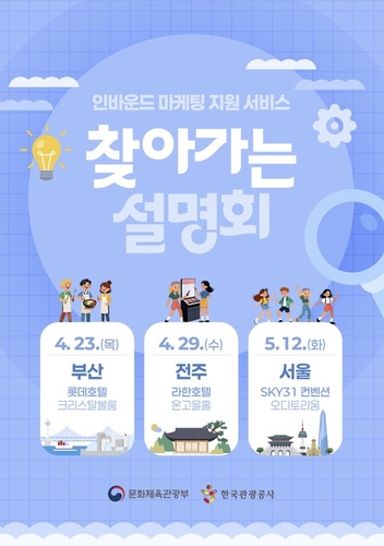 (서울=연합뉴스) 구정모 기자 = 문화체육관광부와 한국관광공사는 외래관광객 유치를 희망하는 업계를 대상으로 '인바운드(방한) 마케팅 지원 서비스' 찾아가는 설명회를 개최한다고 14일 밝혔다.