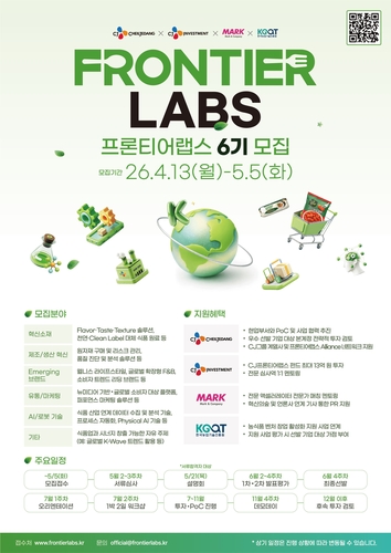 (서울=연합뉴스) 김세린 기자 = CJ제일제당[097950]은 식품 산업의 미래를 선도할 혁신 스타트업을 발굴·육성하는 프로그램 '프론티어랩스 6기'를 모집한다고 14일 밝혔다.