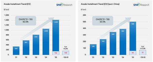 SNE리서치는 "중장기적으로는 실리콘 복합 음극재 확대와 고속 충전 기술, 비중국 공급망 다변화 정책이 구조 변화를 이끌 수 있겠지만, 단기간 내 점유율 구도가 급격히 바뀔 가능성은 제한적일 것"이라고 분석했다.